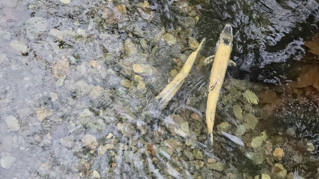 這裡到到處是為了搶雌鮭魚卵受精而大打出手的雄鮭魚。沒有聽錯的話,據說一批卵有時還是會有2到3隻雄魚能受精成功